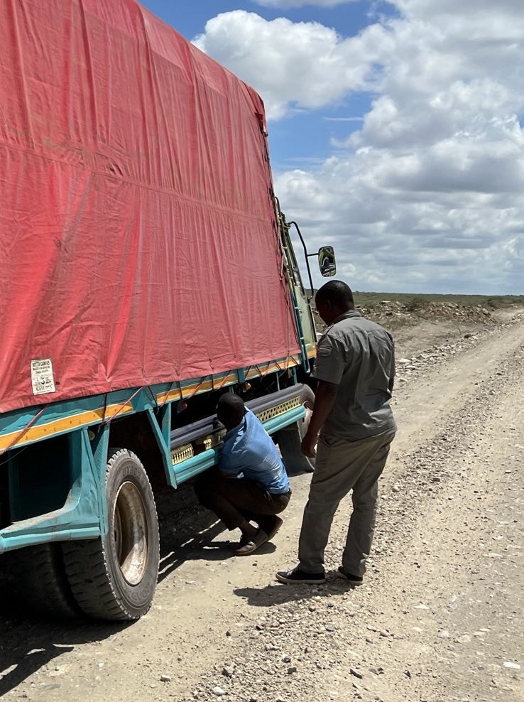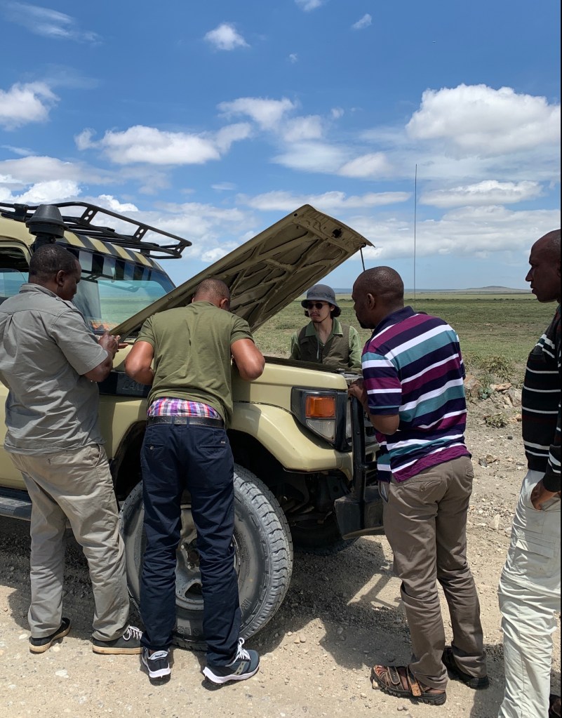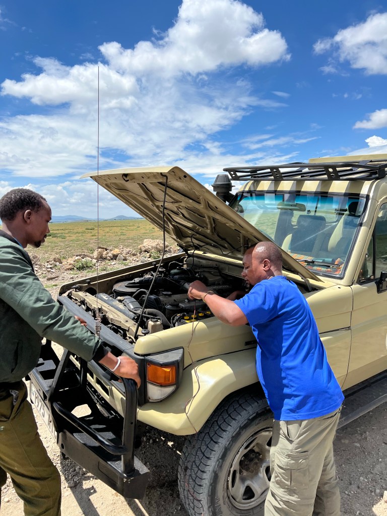 얼마 지나지 않아 맞은편에서 세렝게티 투어를 끝내고 오는 사파리 차량이 우리의 두 번째 선한 사마리아인들이었다. 고객들이 타고 있었음에도 두 명의 현지인 가이드는 오랜 시간 우리에게 도움을 주려고 했다. 자기들의 차로 우리 차를 밀어서 시동이 걸리는지도 시도했지만 헛수고였다. 부품의 결함임이 확실해졌다.